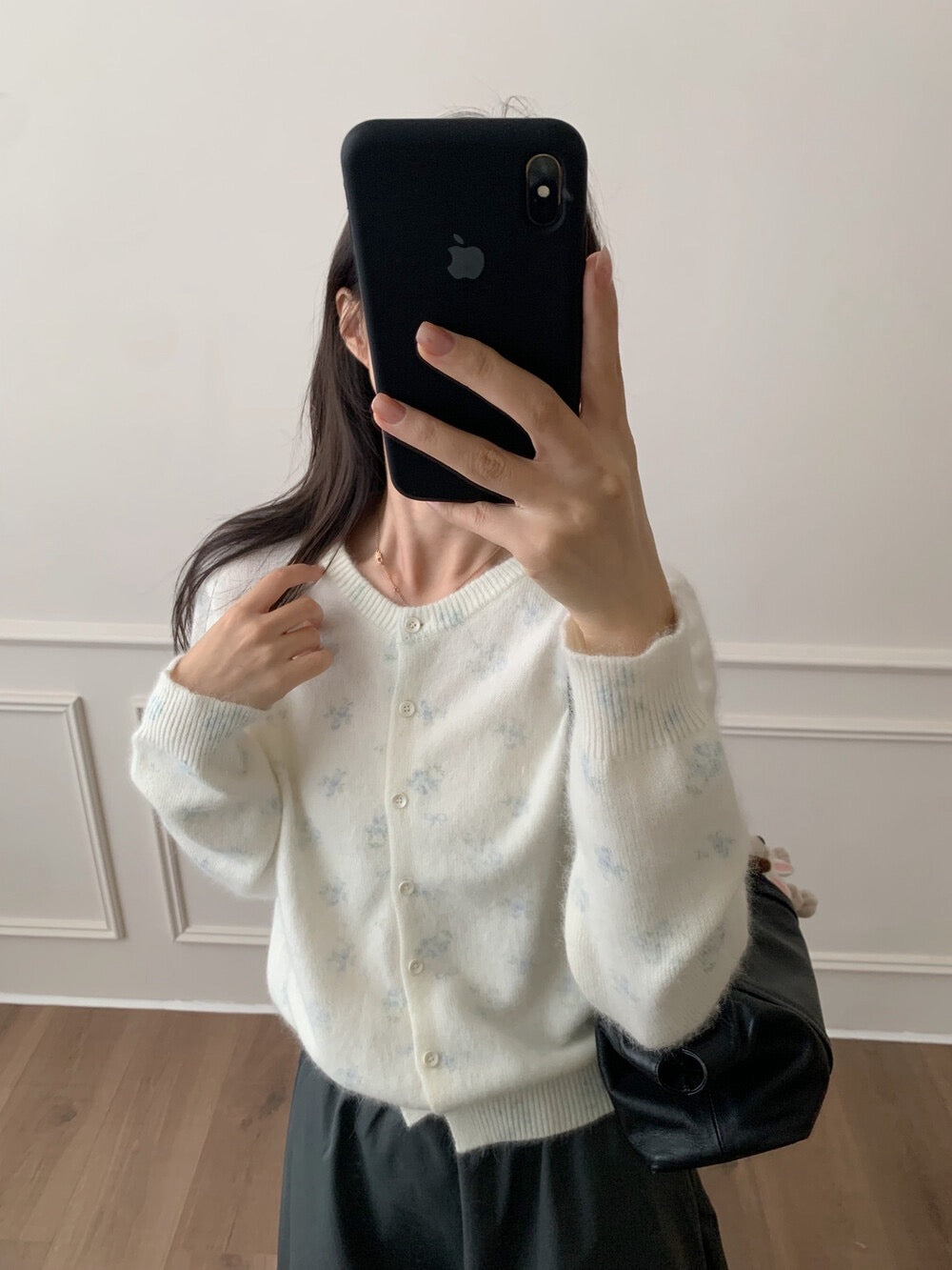 Made from a premium raccoon-wool blend, it features a gentle brushed texture and a delicate floral print design that brings out a refined, vintage-inspired charm.