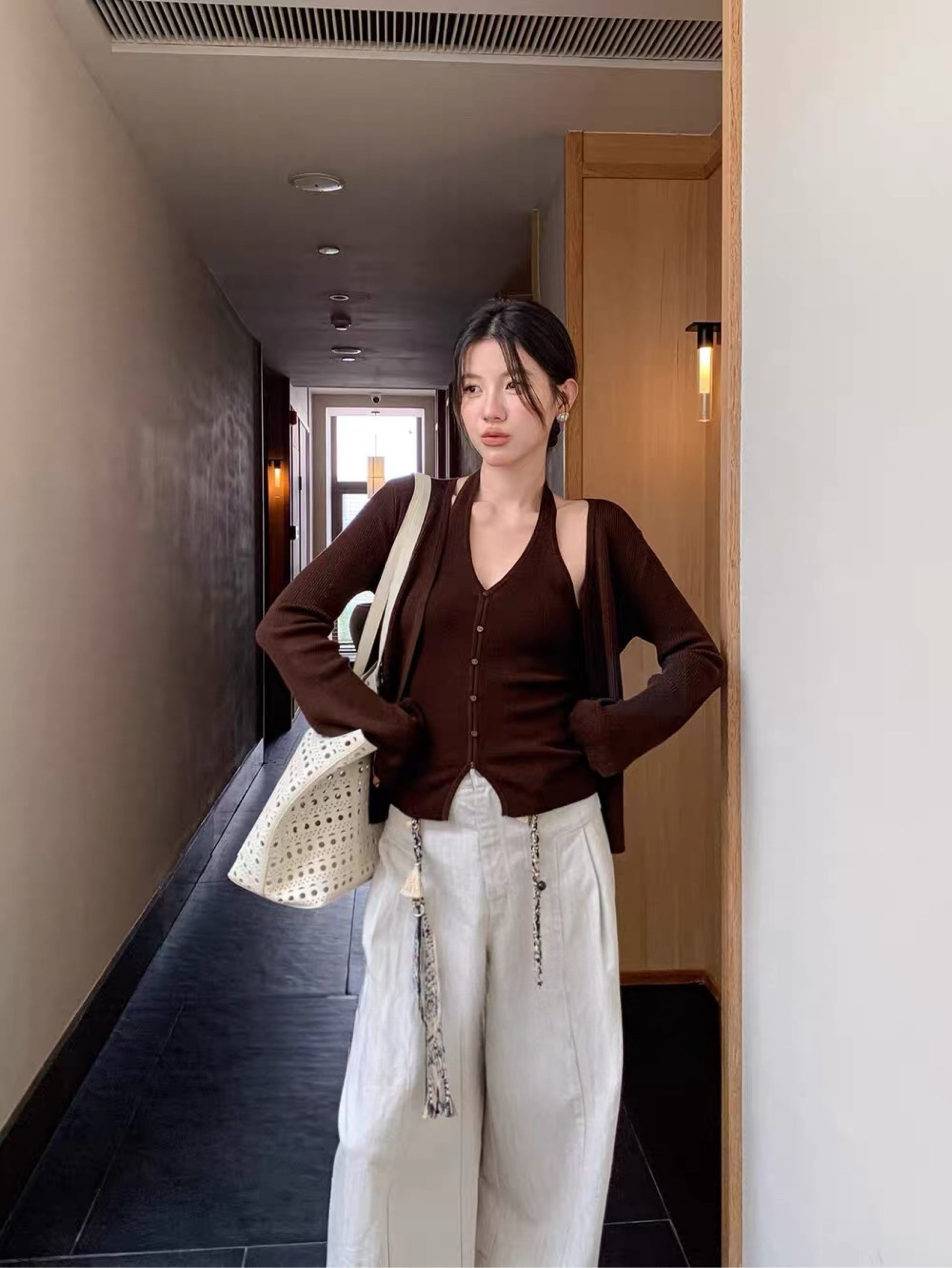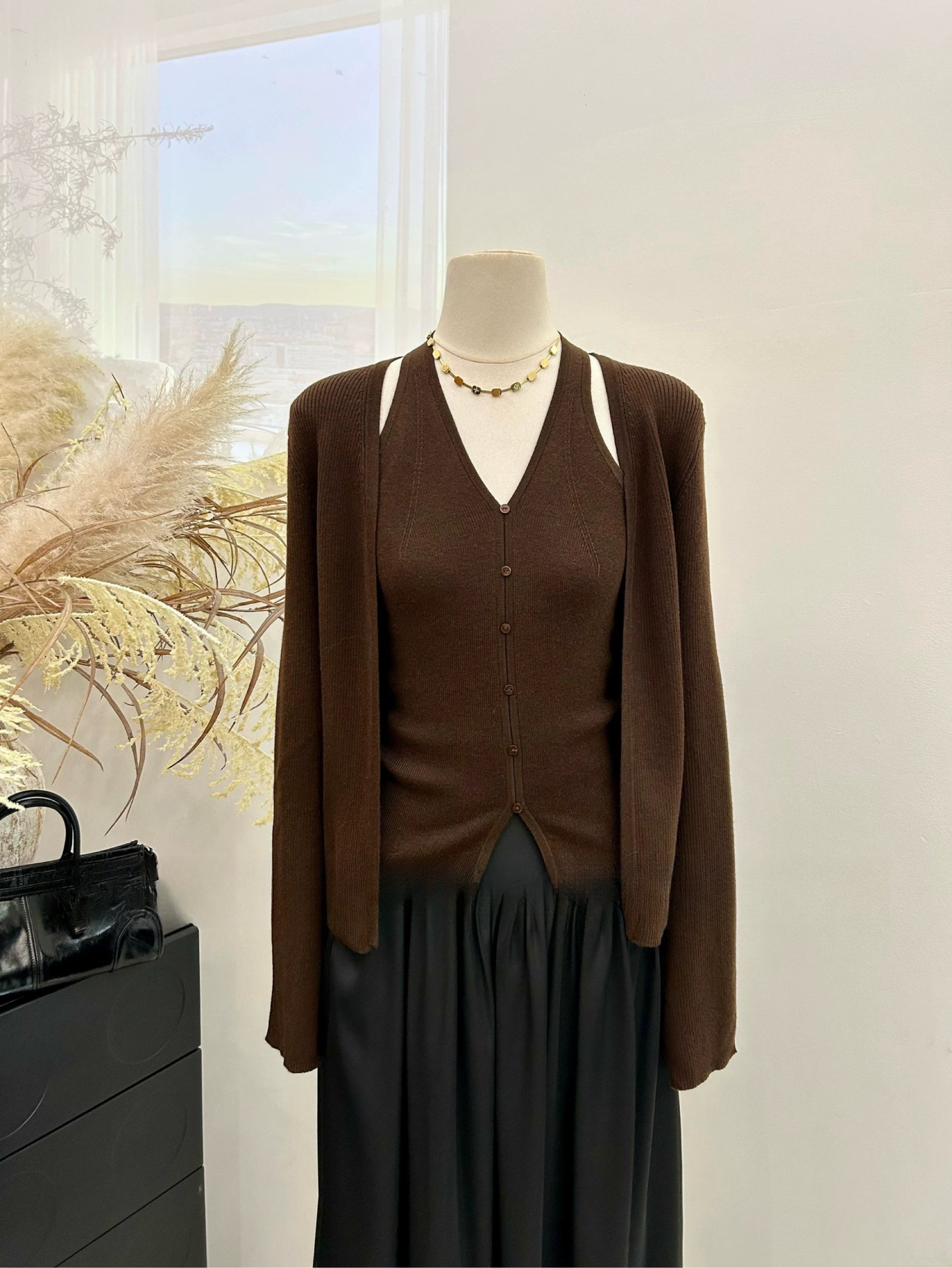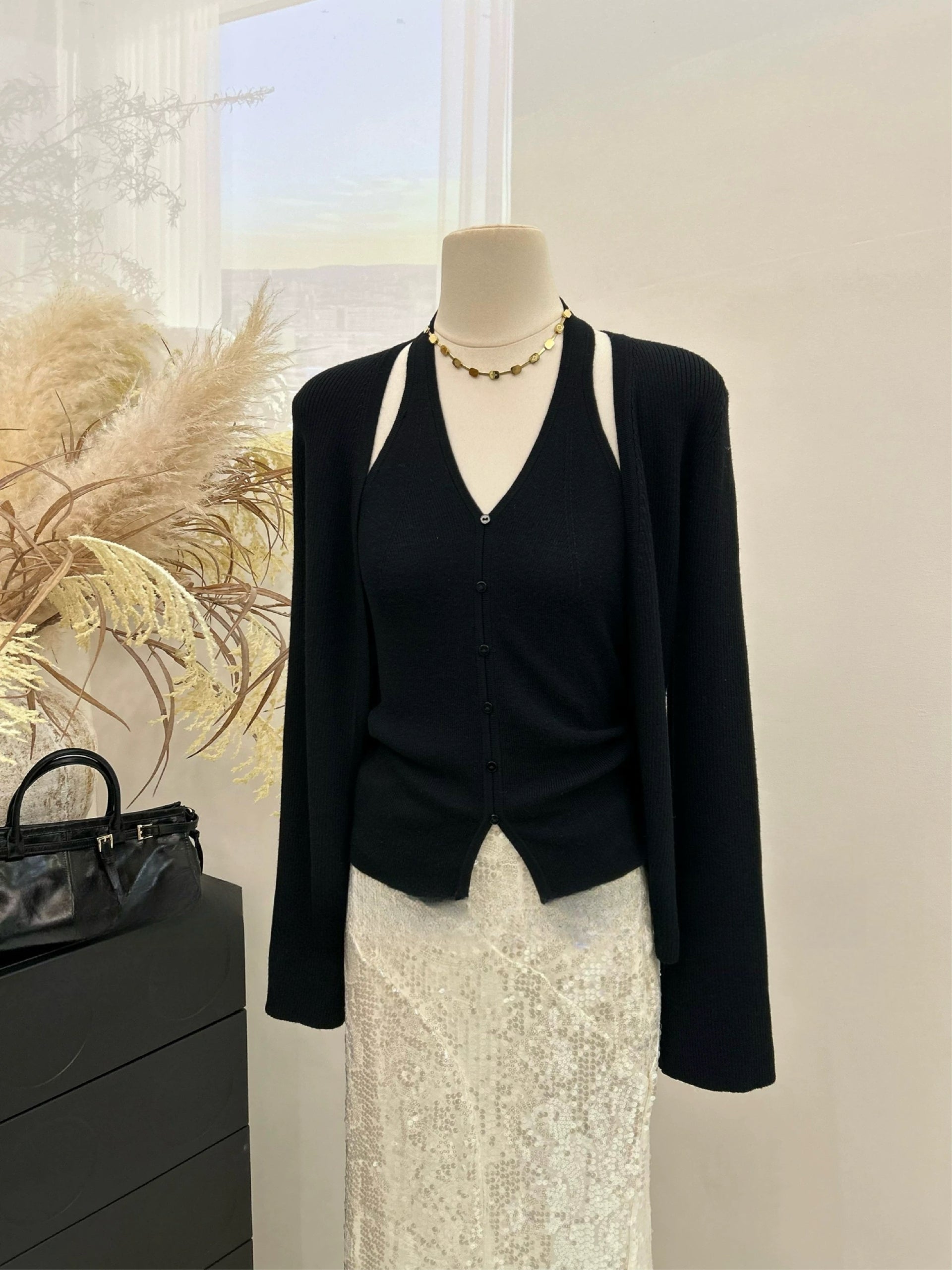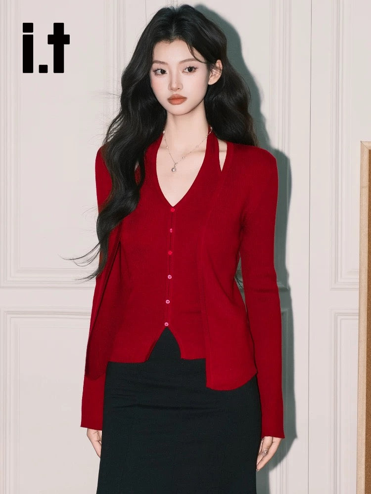 A refined two-piece knit set featuring a halter-style knit tank paired with a soft long-sleeve cardigan. Designed with a flattering V-neckline, slim fit, and clean minimal lines, this set elevates any outfit with effortless elegance.