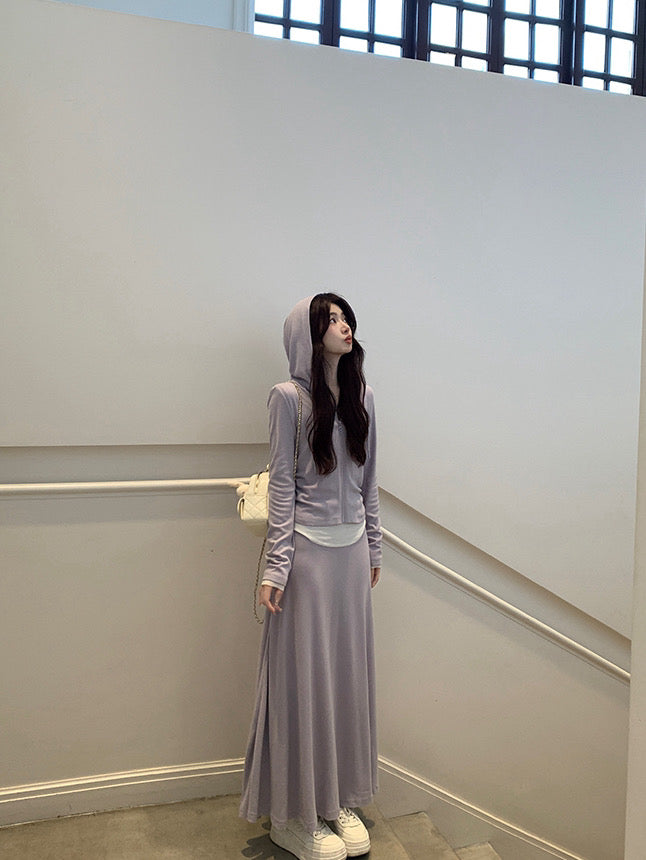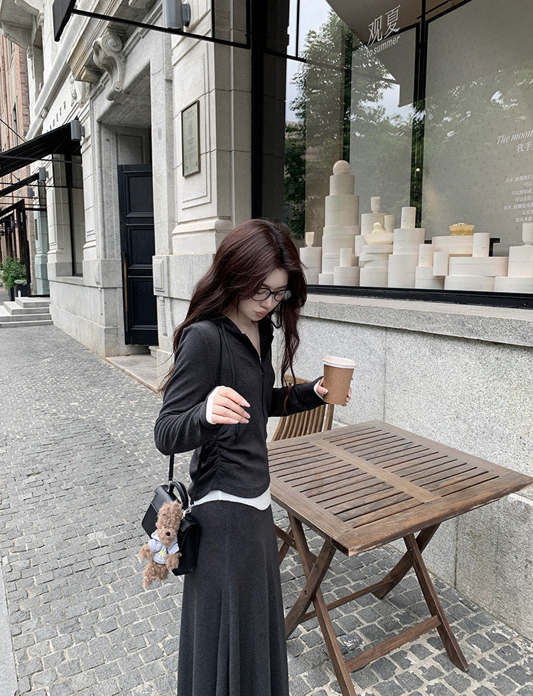 A stylish Korean-inspired three-piece set featuring a lightweight shirt, fitted tank top, and a drawstring mini skirt. This layered outfit creates an effortless and trendy look that is perfect for warm weather.