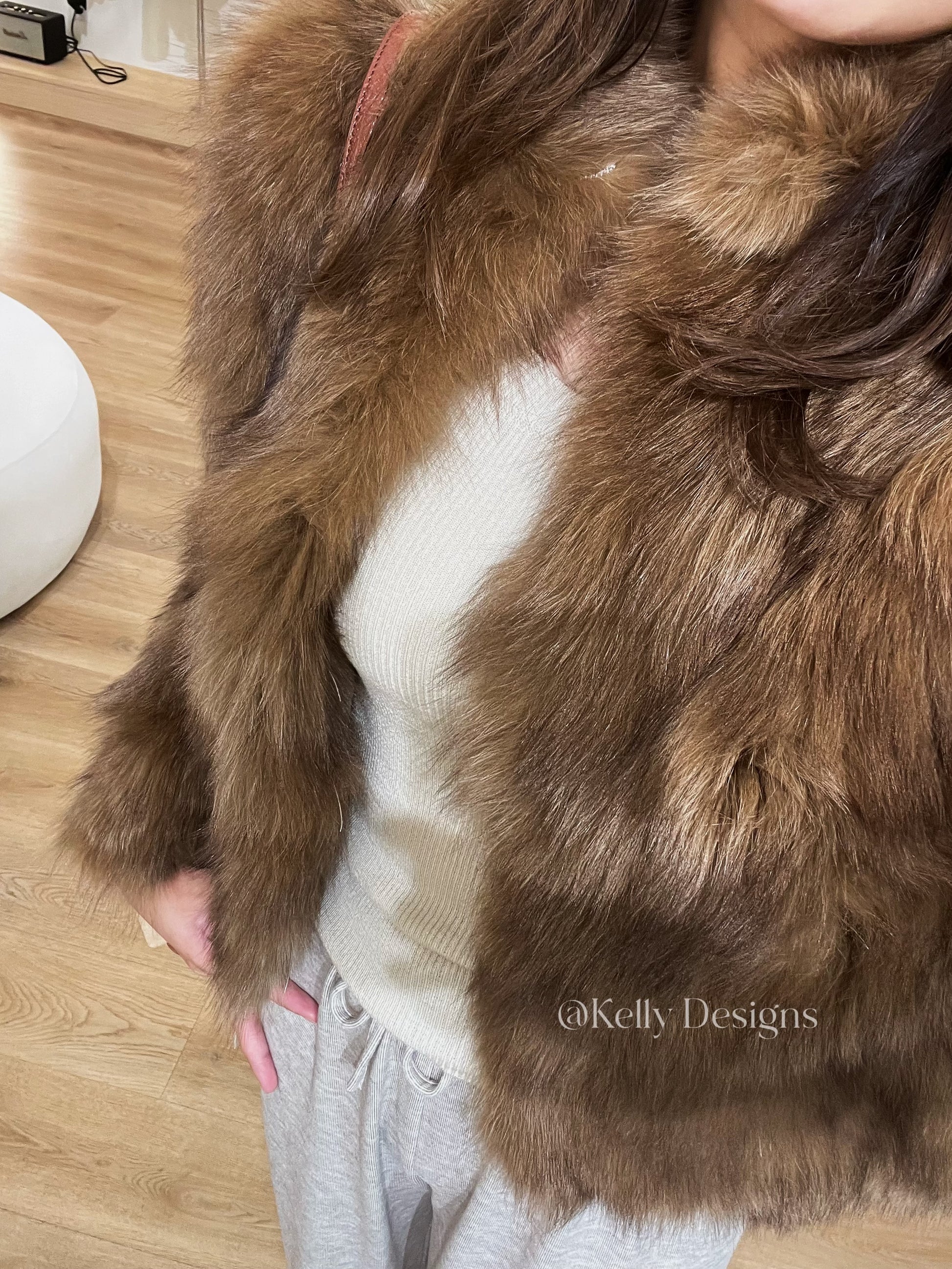 Kelly Designs Brown Fox Fur Jacket with High Neck (Instock)