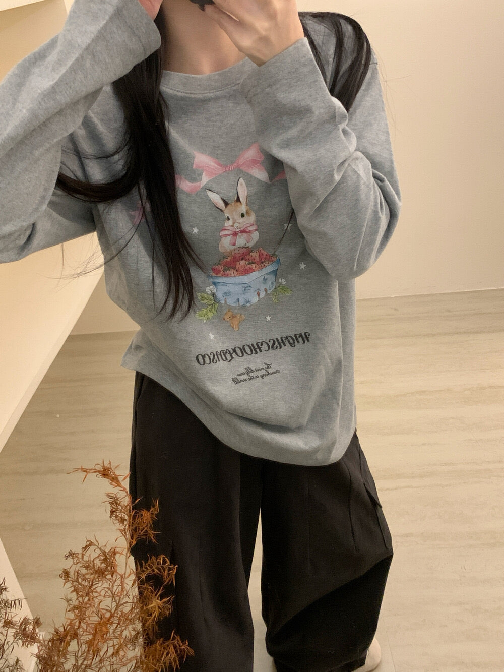 A soft and cozy long-sleeve tee made from brushed cotton, giving it a warm, velvety touch perfect for everyday wear. Designed with an adorable bow & strawberry bunny print, this tee adds a playful Korean casual vibe to any outfit. Easy to layer with cardigans, vests, or jackets.
