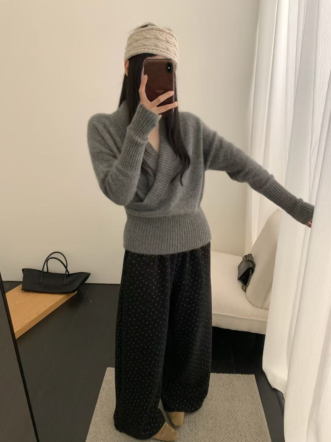 A luxurious raccoon wool blend wrap-style knit sweater featuring a soft, naturally fluffy texture.