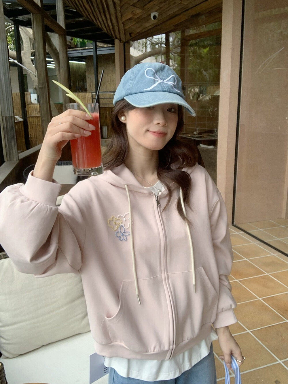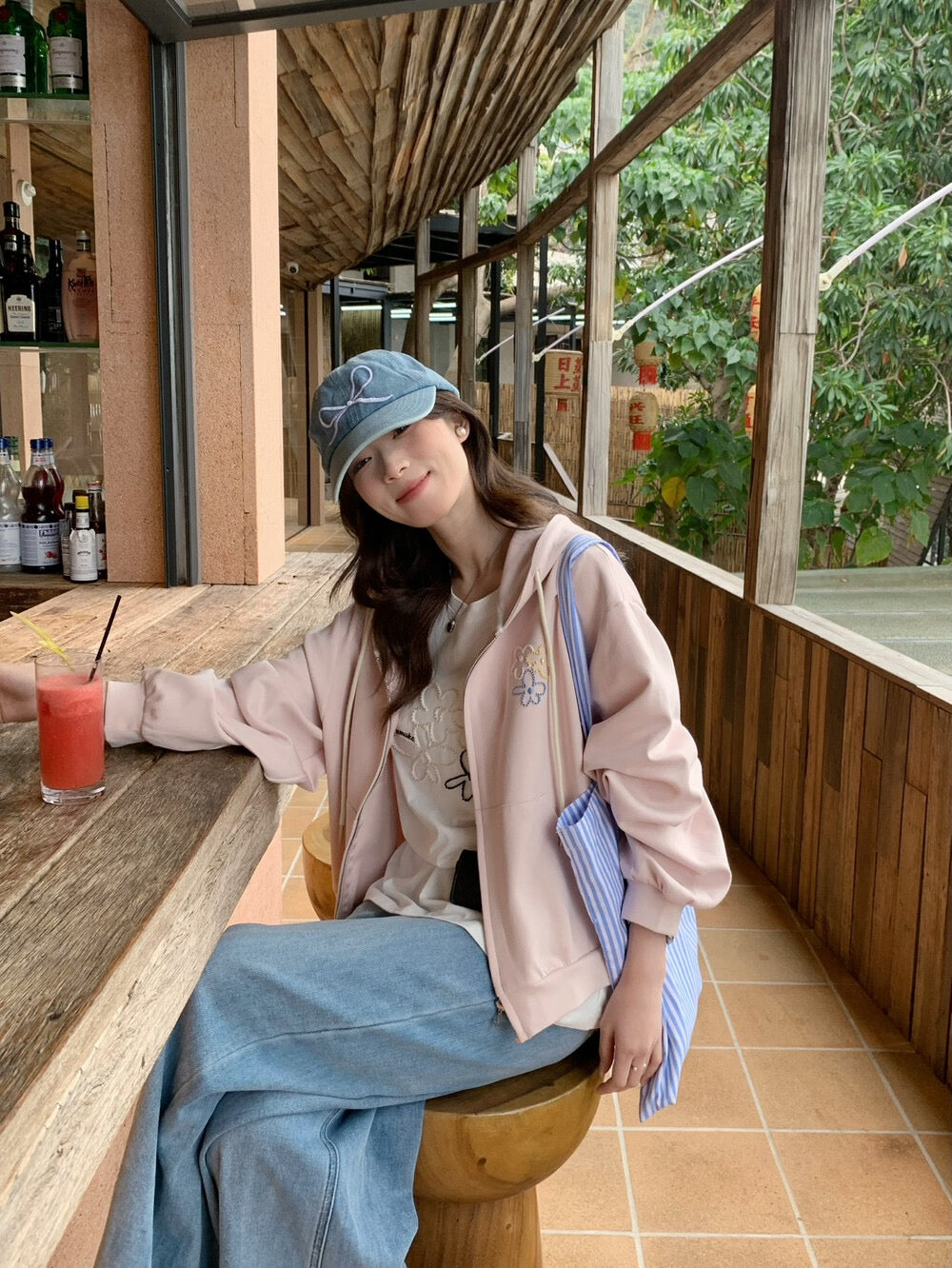 A casual and cute zip-up hoodie designed with delicate embroidery details and a relaxed silhouette. The soft fabric and slightly oversized fit create a comfortable and effortless Korean-inspired everyday look.