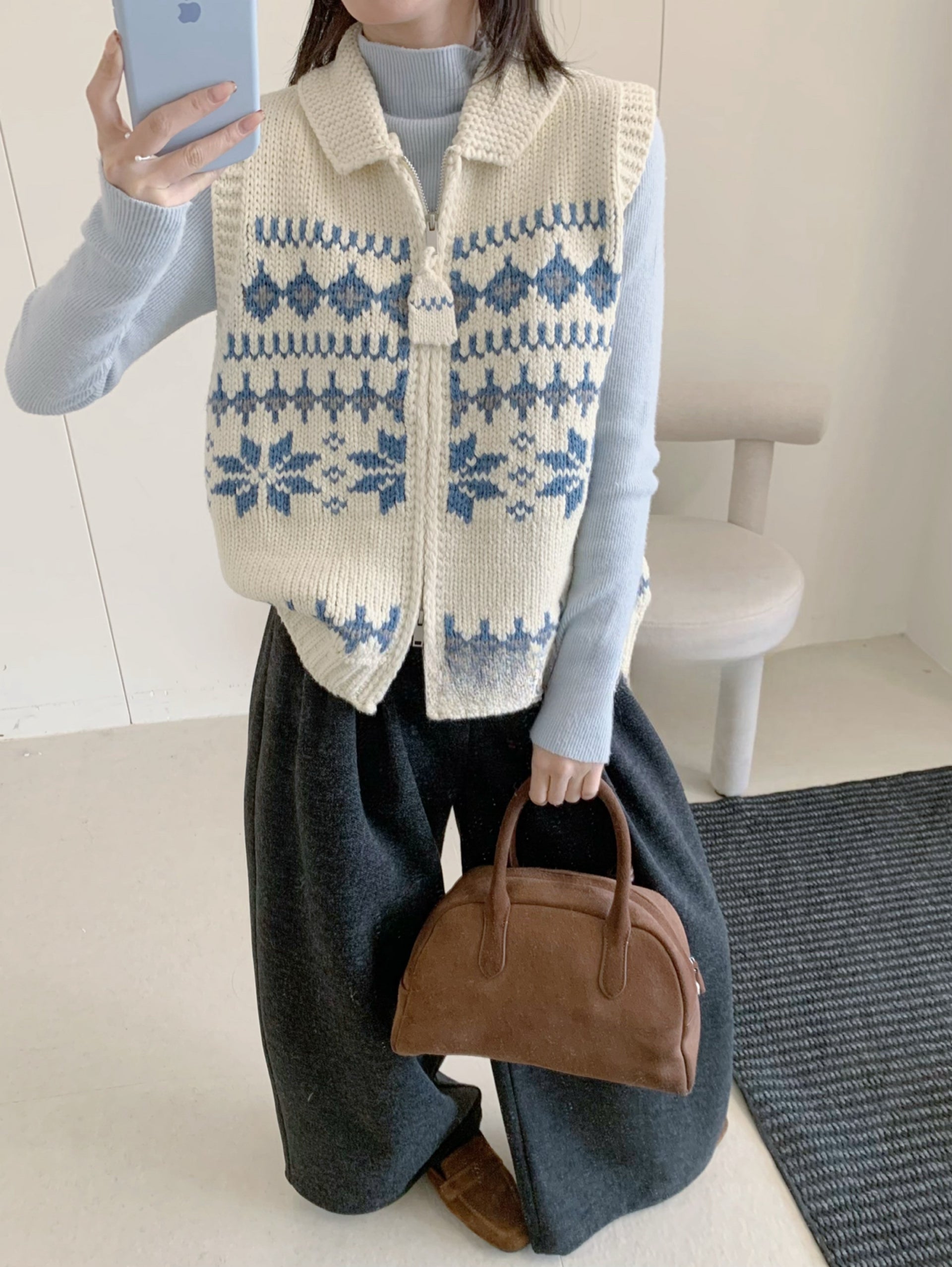 Kelly Designs Fair Isle Double-Zip Knit Vest – Cozy & Versatile-Beige (Instock)