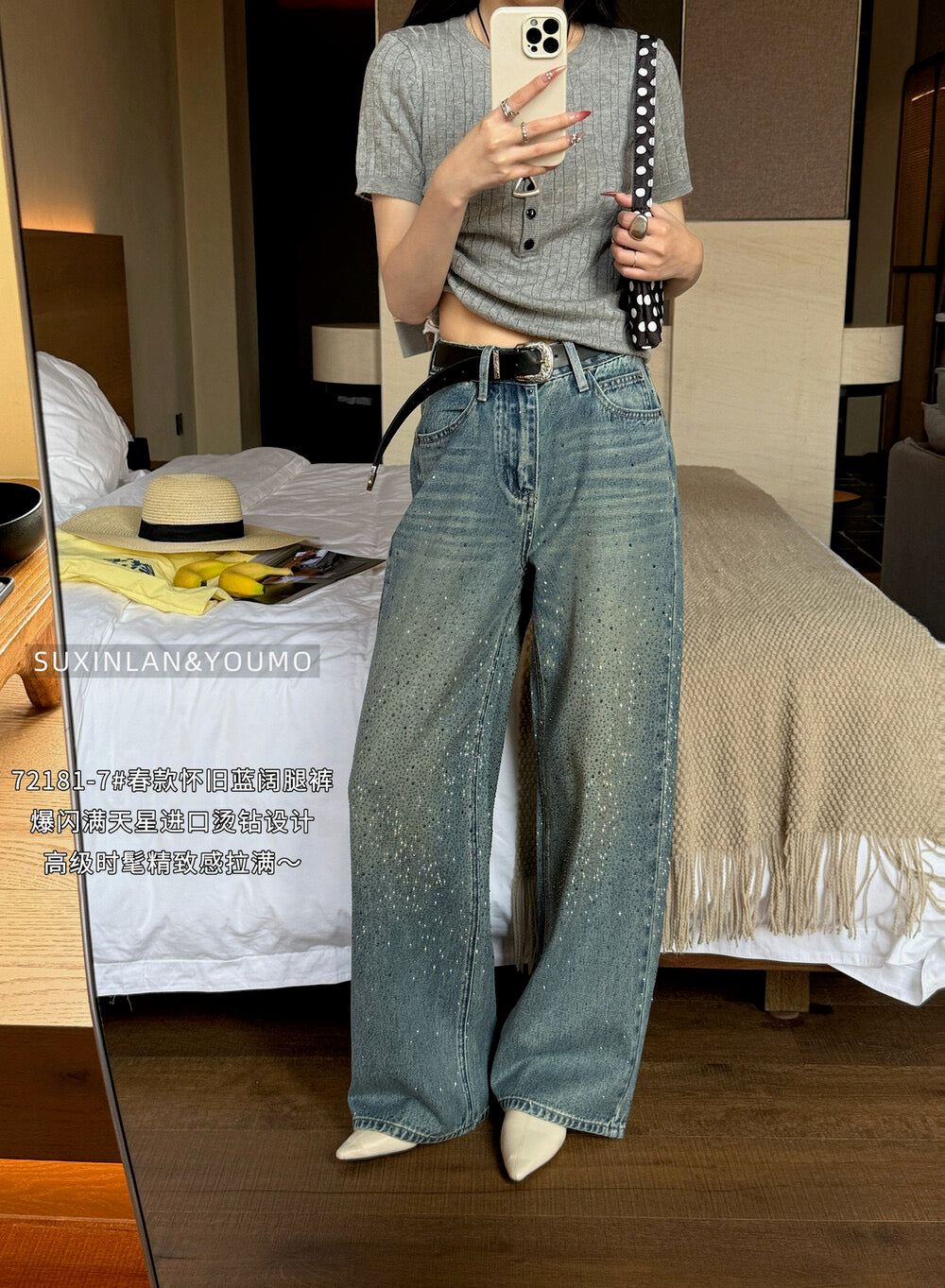 Kelly Designs Rhinestone Wide-Leg Jeans with Belt – Vintage Blue (Instock)