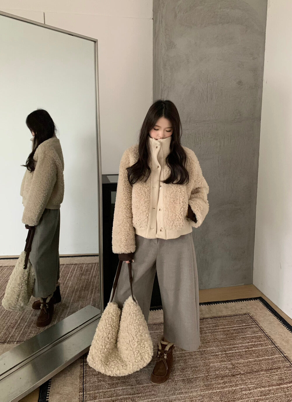 This teddy fleece short jacket features a plush, fluffy texture paired with ribbed knit trims for a refined finish. The stand collar design keeps you warm while adding a clean, modern silhouette.