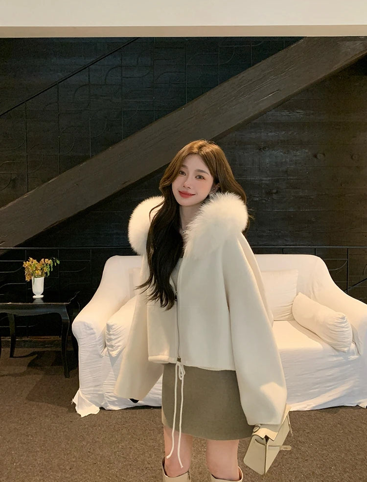 Kelly Designs Fox Fur Hoodie Zip Up White Wool Coat (10 days)