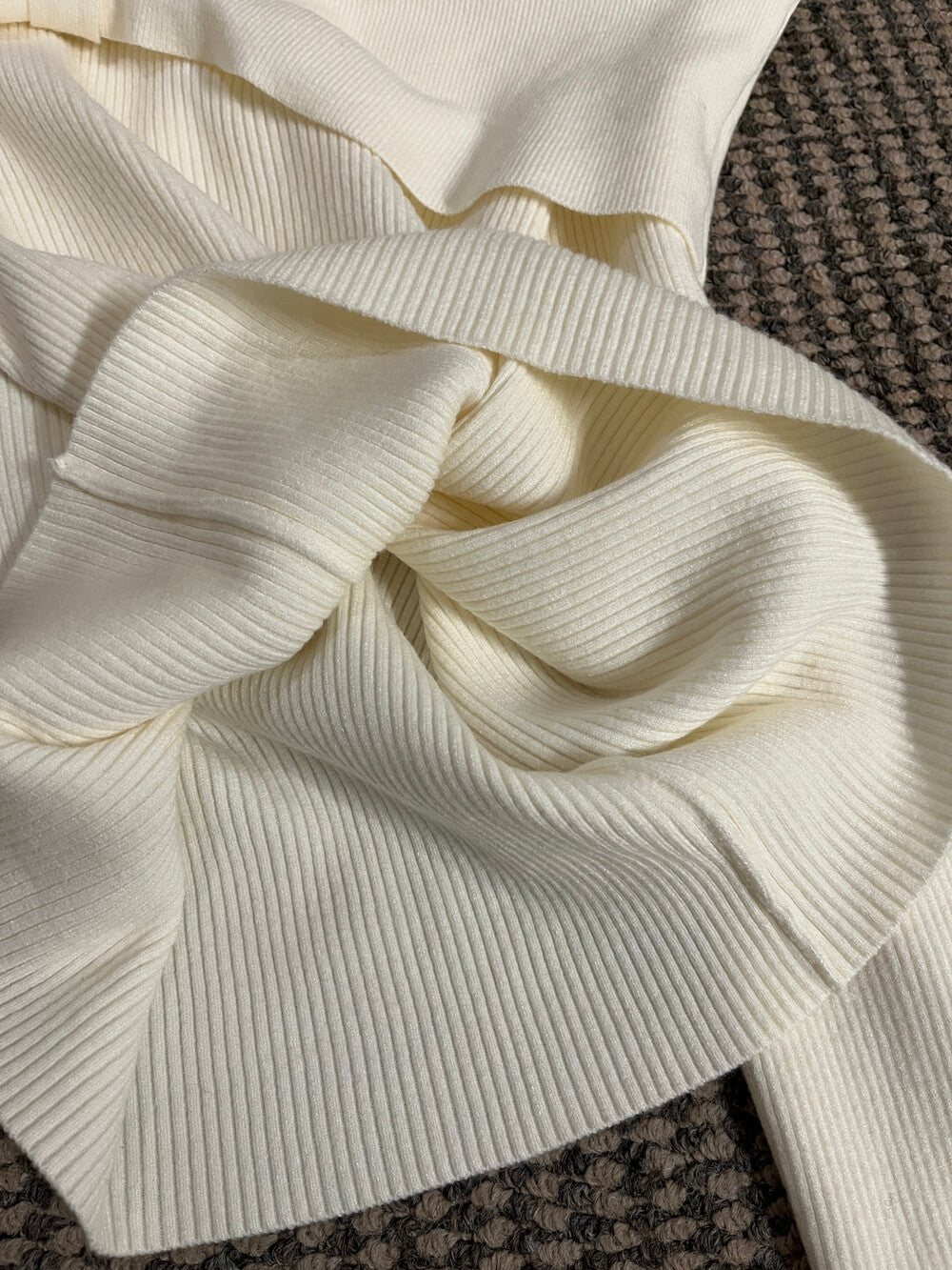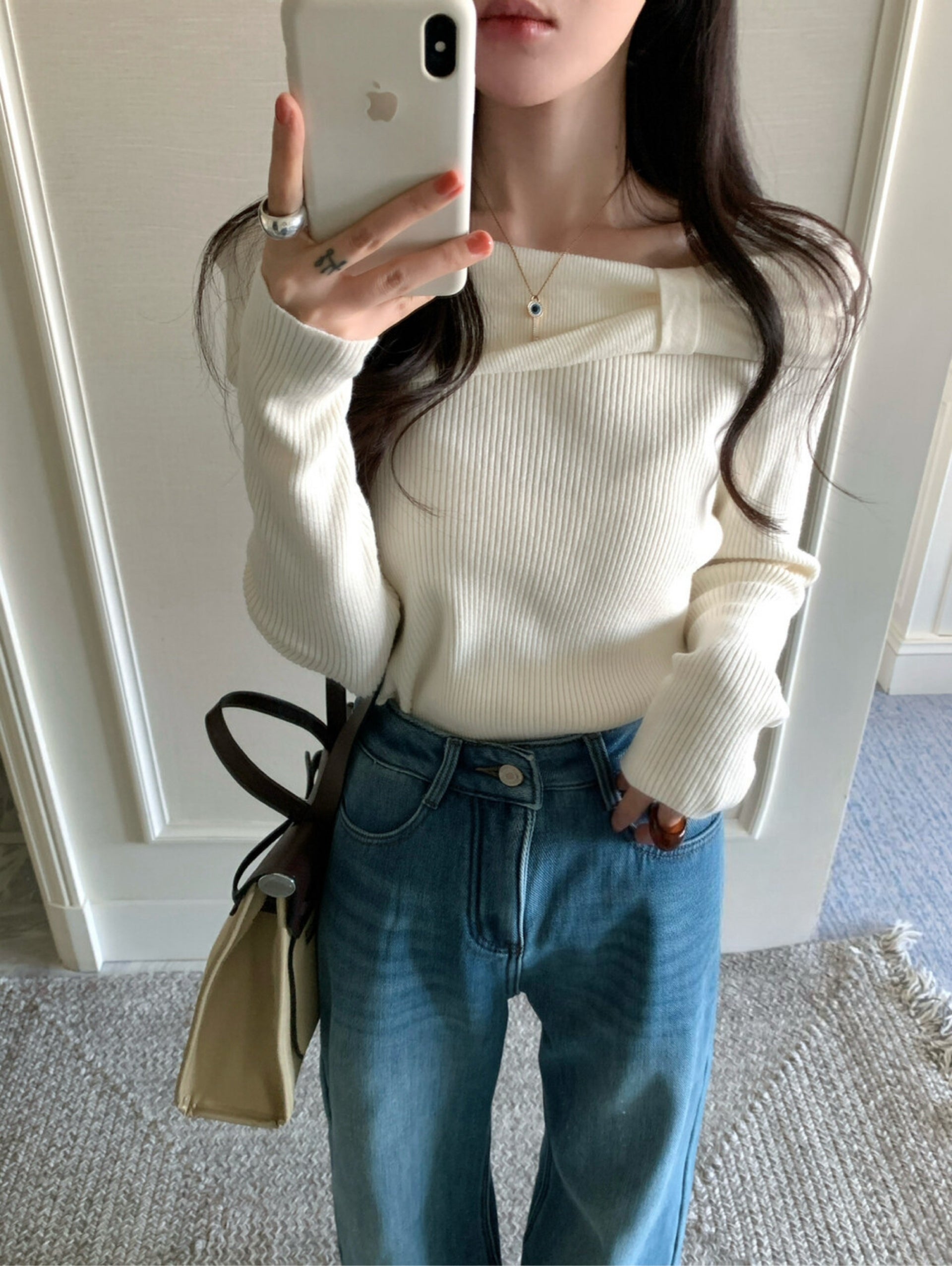 This off-shoulder ribbed knit top features a soft neckline that beautifully highlights the collarbone, creating a feminine and elegant silhouette. The slim-fit ribbed fabric hugs the body comfortably, delivering a clean, refined look with subtle “soft-glam” appeal.