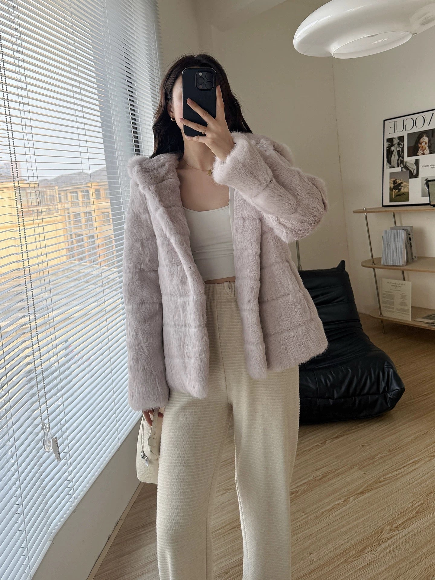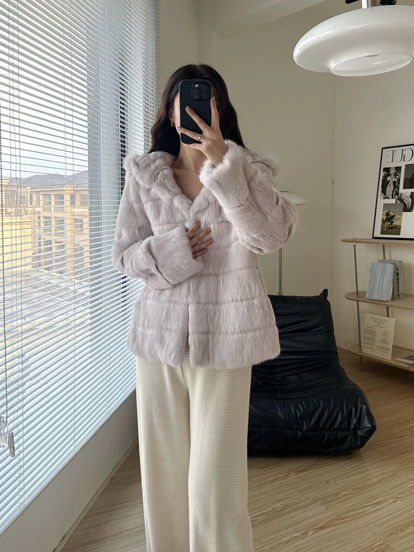 Crafted from premium grass rabbit fur, this jacket features an ultra-soft, fine texture with a naturally fluffy look.