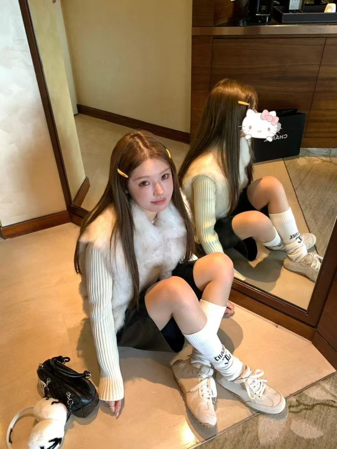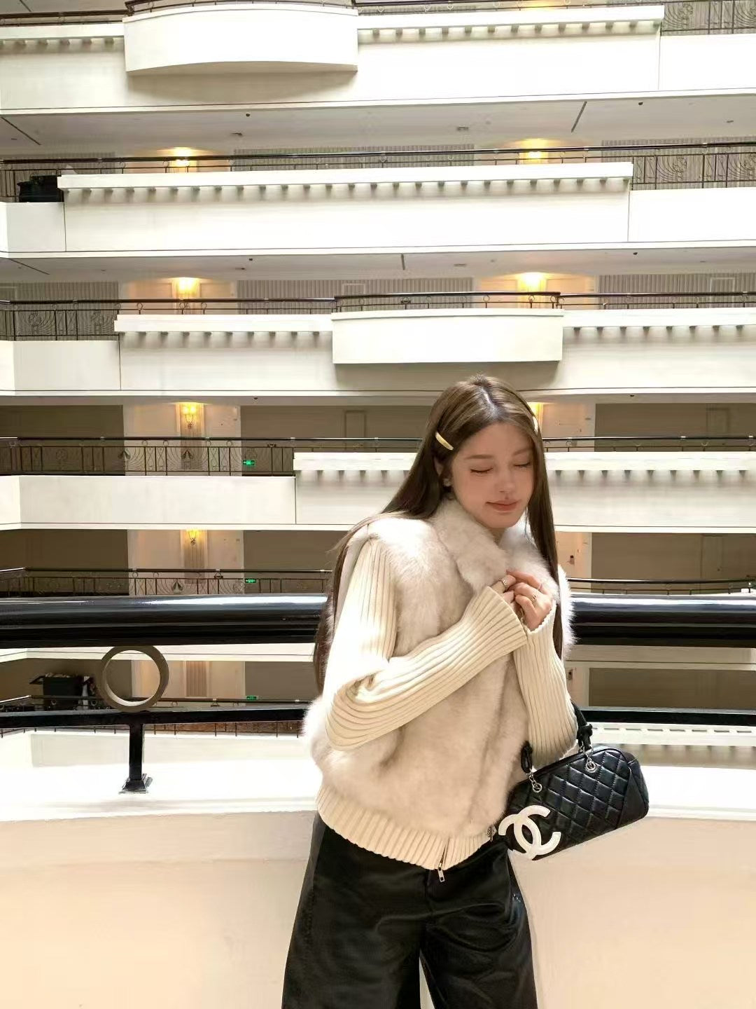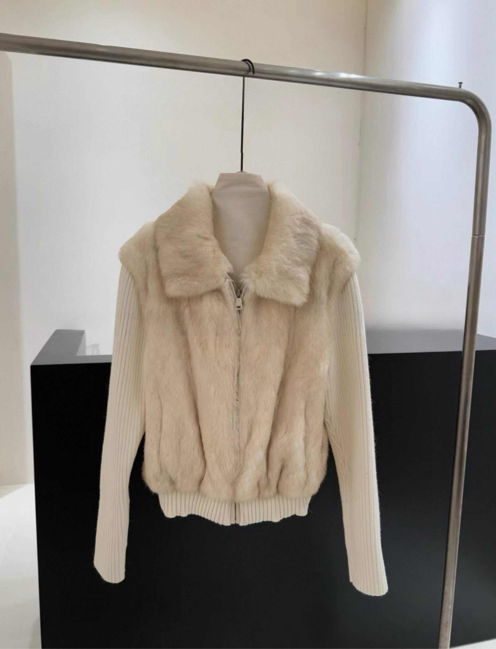 A luxurious blend of softness and structure—this jacket features genuine Rex rabbit fur on the front and collar, paired with high-stretch ribbed knit sleeves and hem for a comfortable, slimming fit. The fur is plush, velvety, and naturally glossy, giving the piece a refined Korean high-end winter look.