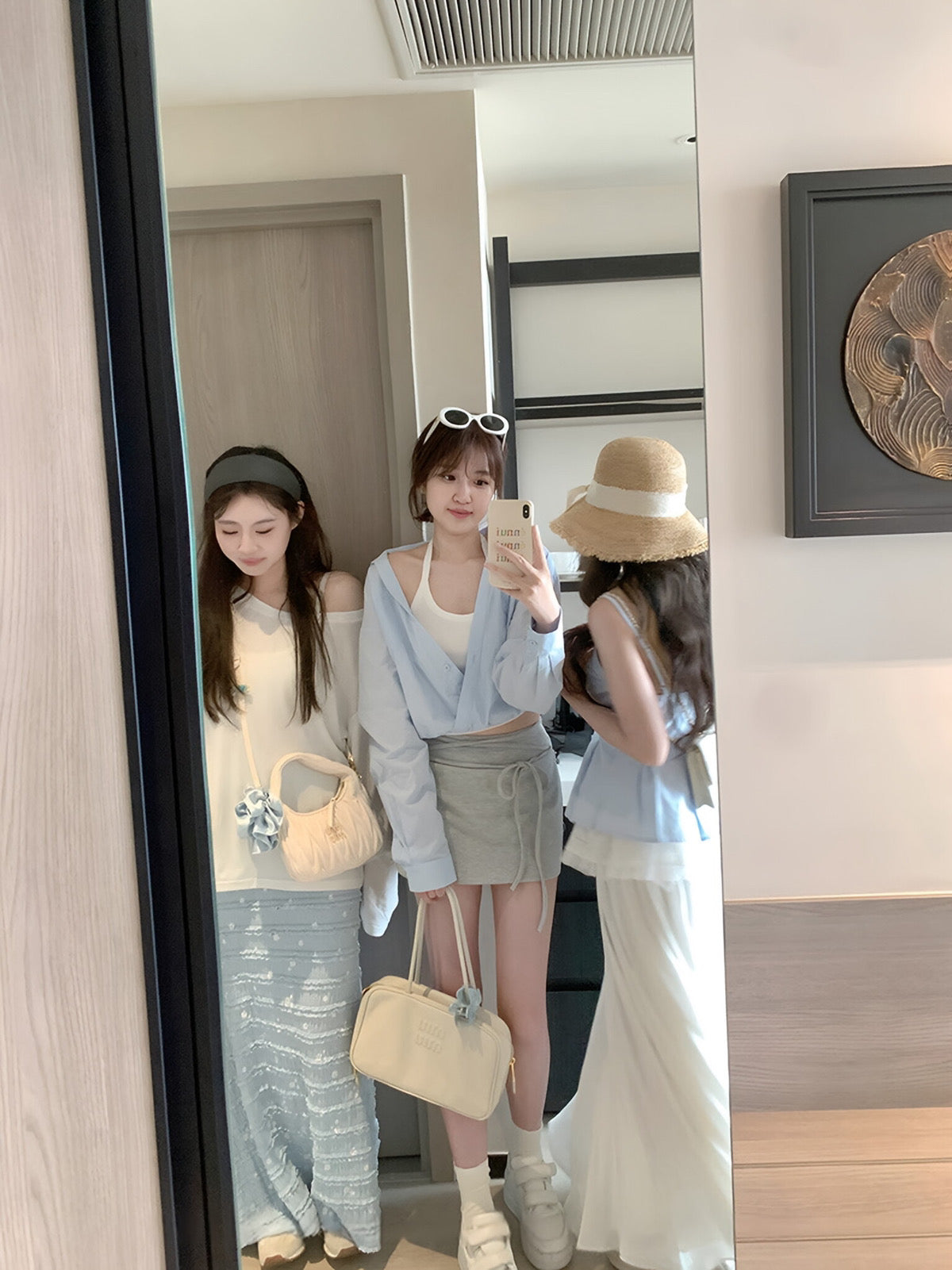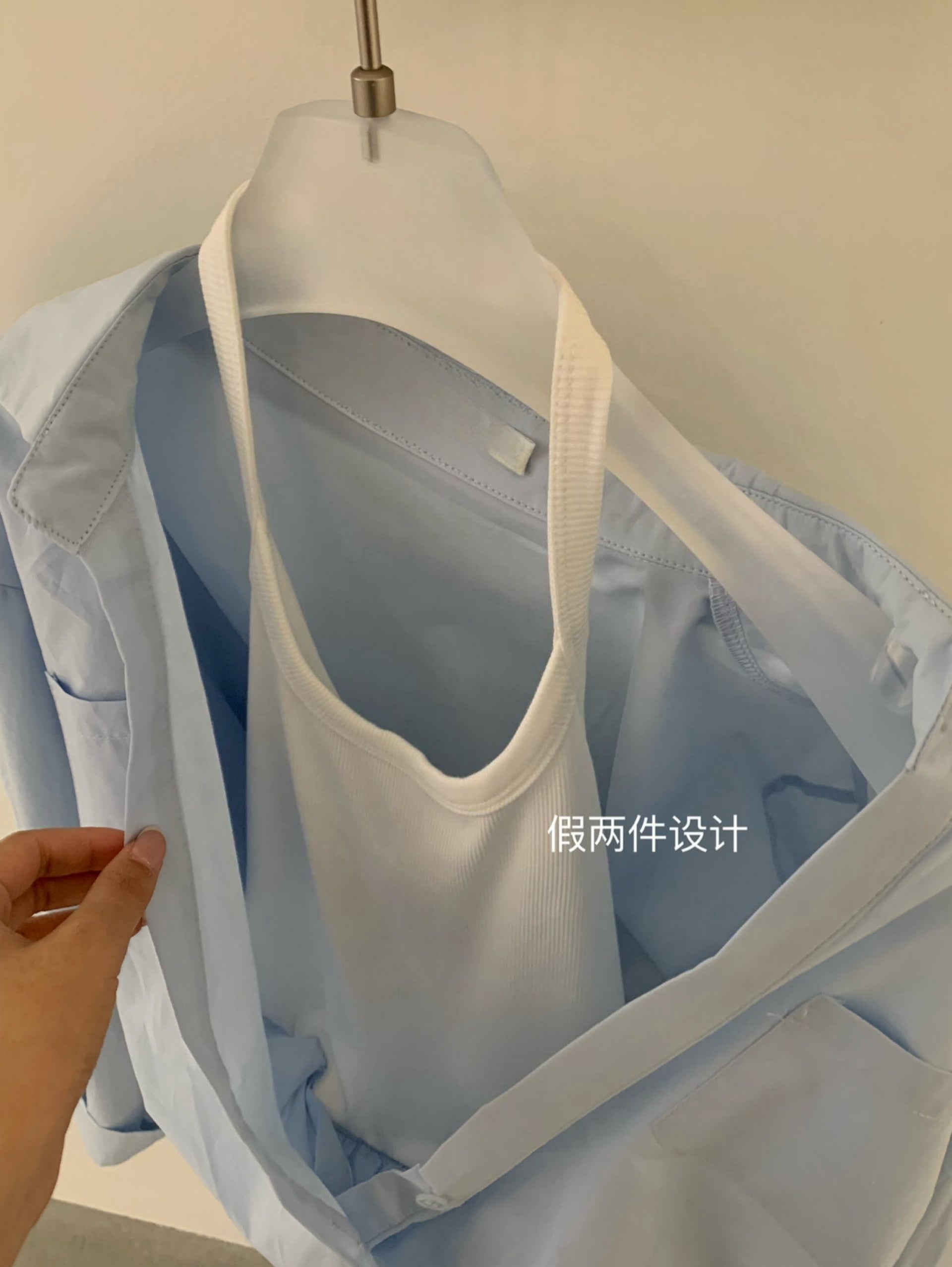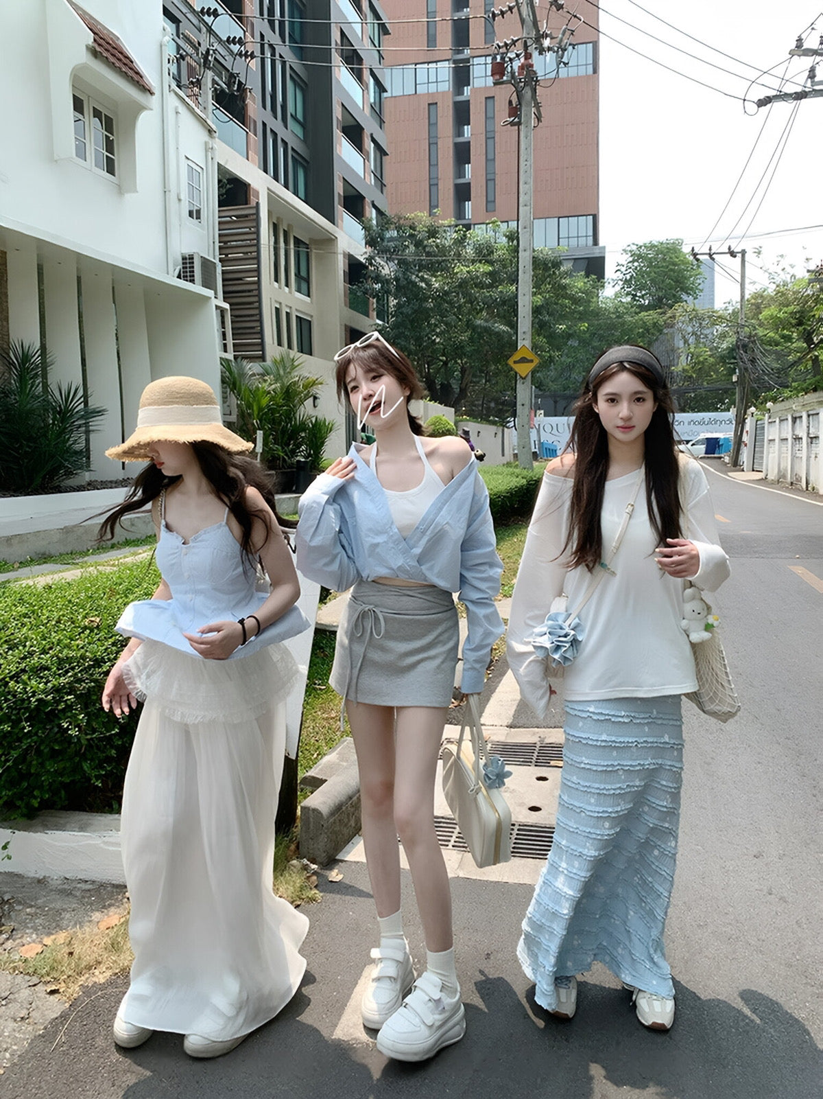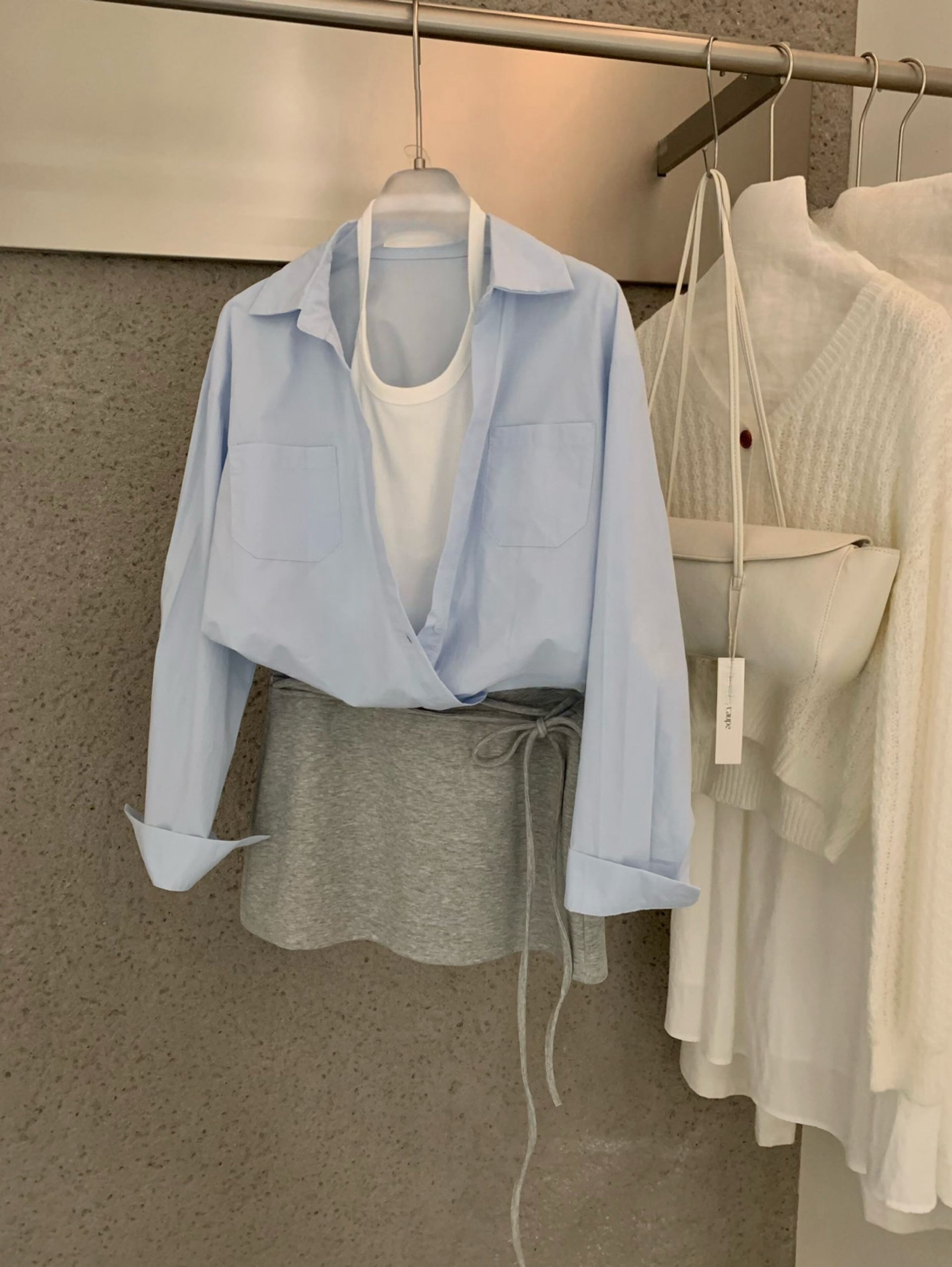 A stylish Korean-inspired three-piece set featuring a lightweight shirt, fitted tank top, and a drawstring mini skirt. This layered outfit creates an effortless and trendy look that is perfect for warm weather.