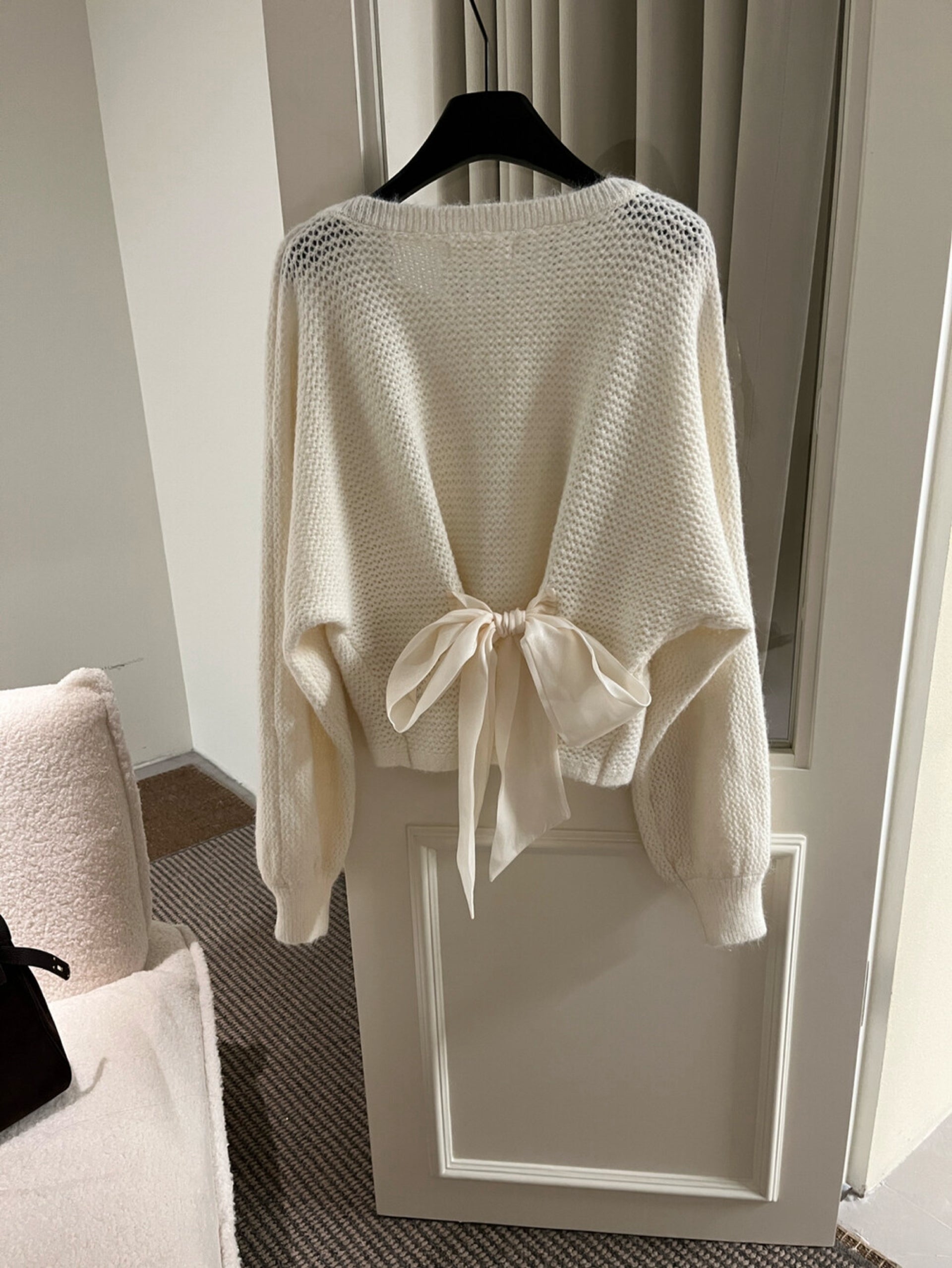 This off-shoulder sweater features a relaxed neckline that subtly highlights the collarbone, while the back ribbon tie adds a romantic, eye-catching finish from behind.