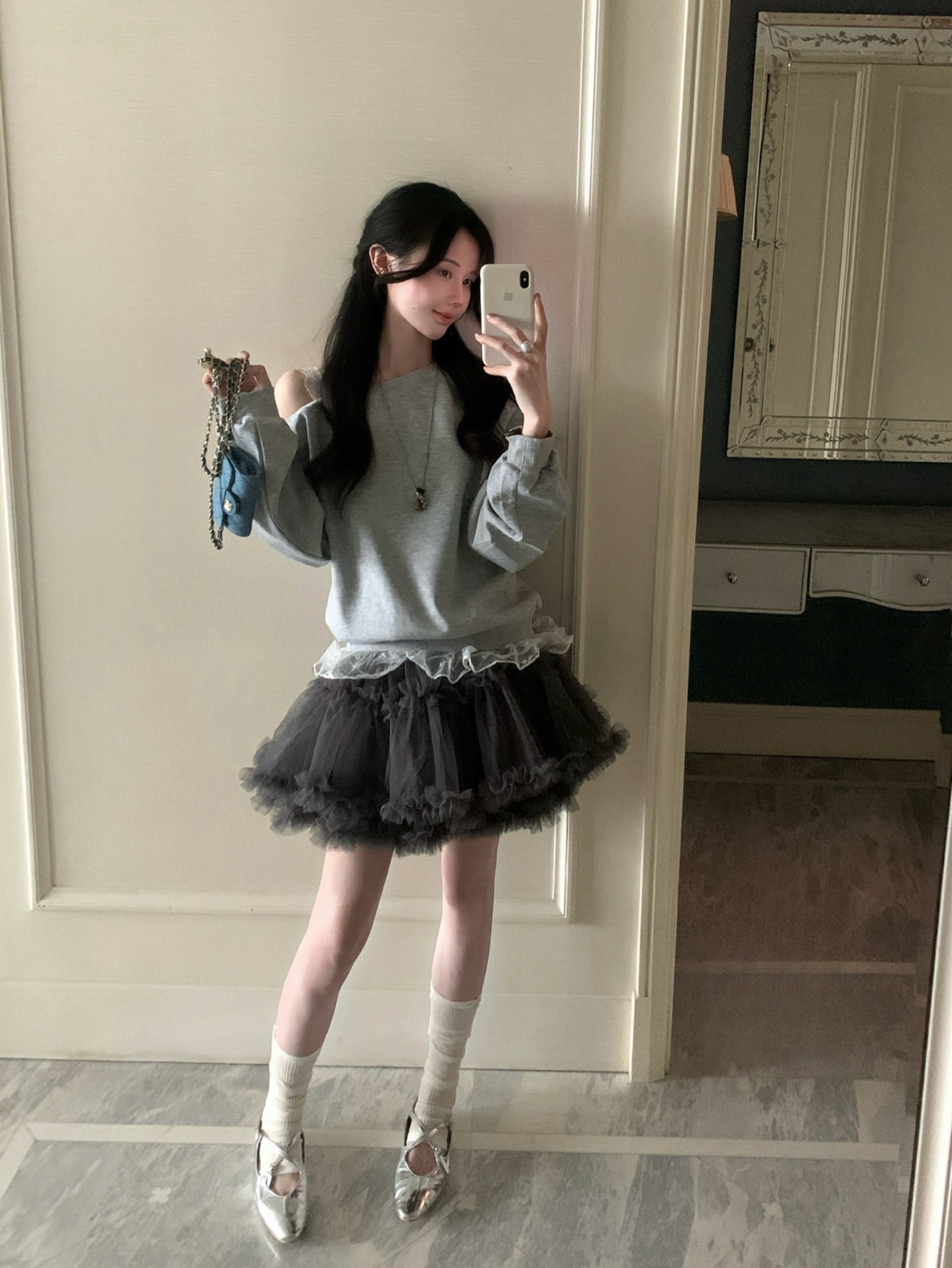 Kelly Designs Off-Shoulder Faux Layered Sweatshirt & Grey Skirt (Instock)