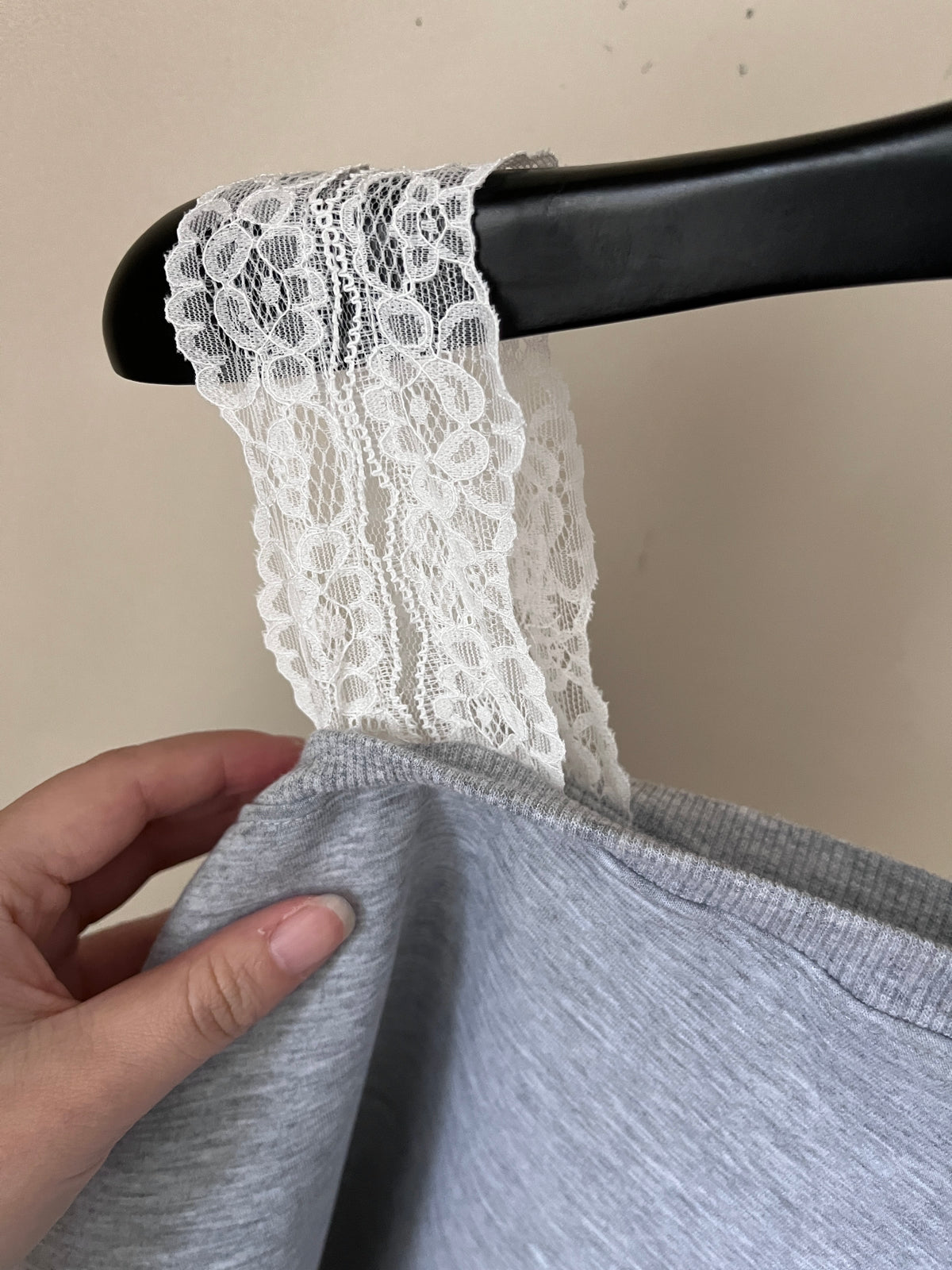 The relaxed silhouette combined with the subtle lace trim creates the illusion of a layered outfit while remaining comfortable and effortless to wear.