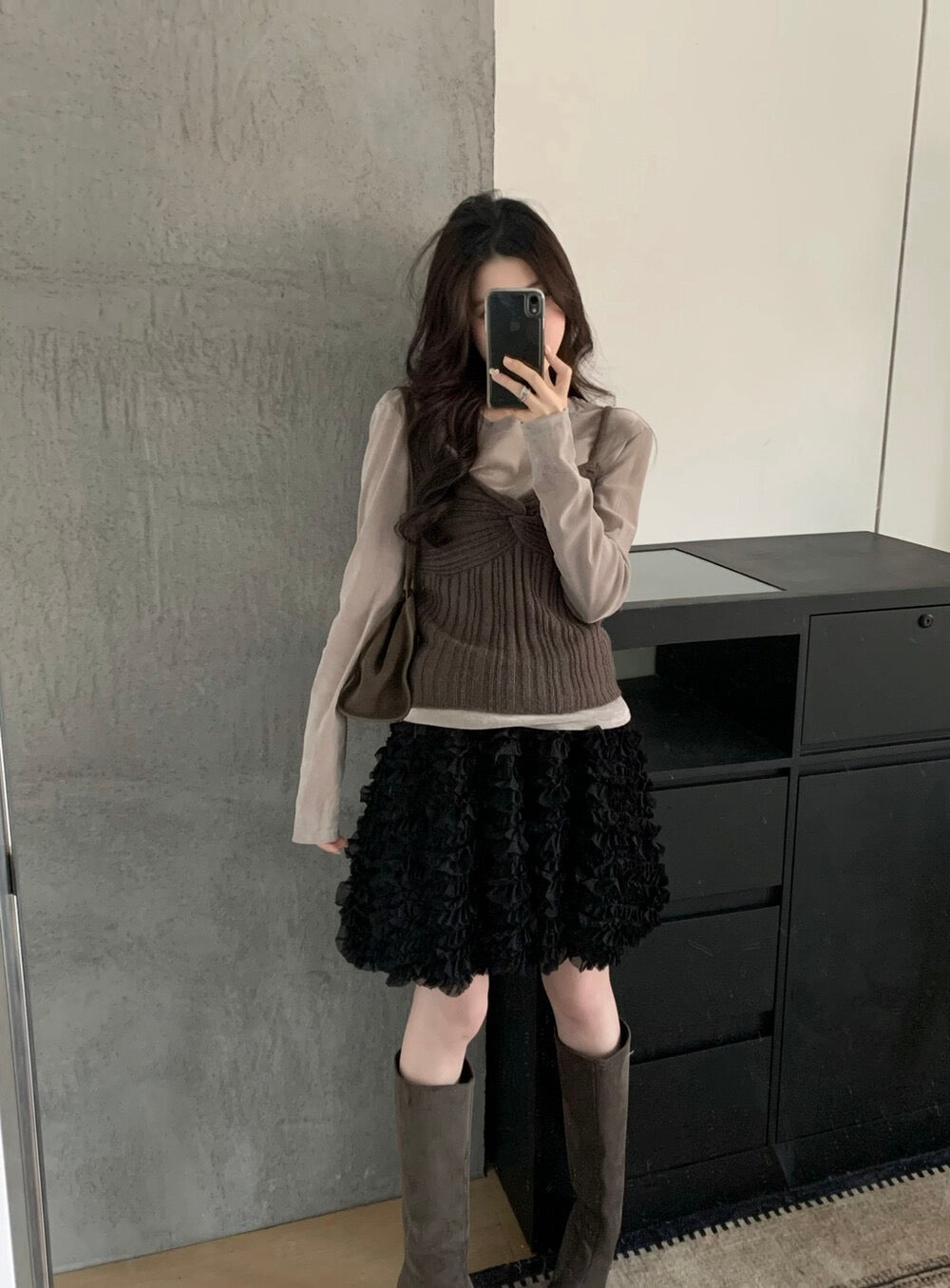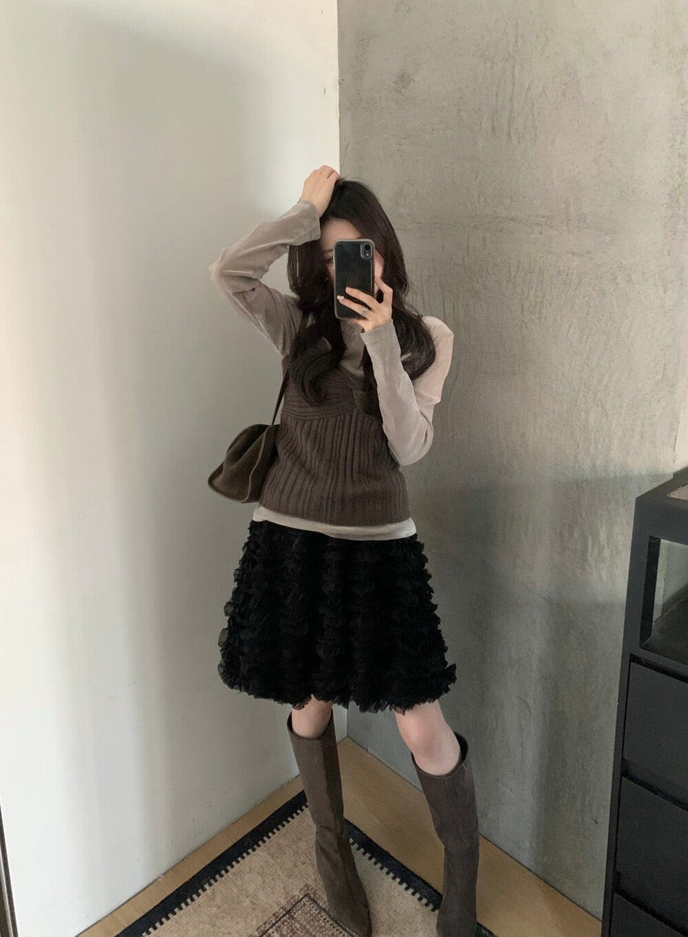 The fitted knit vest adds structure, while the lightweight inner top creates a soft, feminine contrast—perfect for a chic Korean look.