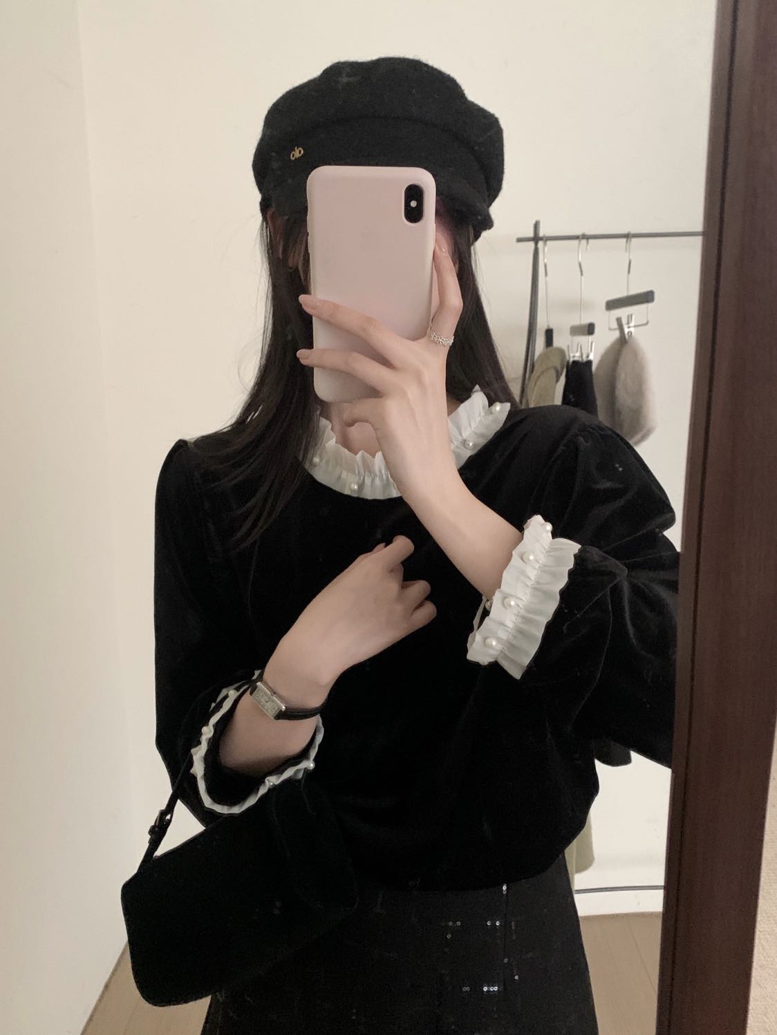 A romantic velvet top designed with delicate ruffle details for a soft, elegant look.